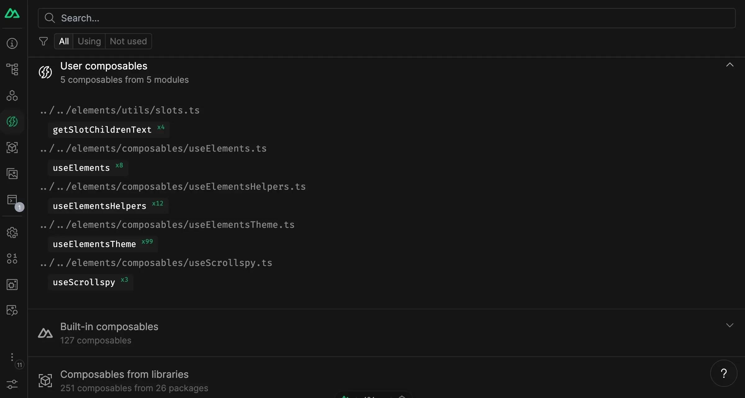Discover all the auto-imports composables and utils registered in your app. You can see which files are importing them, and where they are from. Some entries can also provide short descriptions and documentation links.